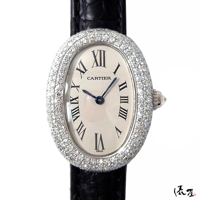 【国際保証書】 カルティエ K18WG ベニュワール【ダイヤベゼル】極美品 レディース 腕時計 【送料無料】 Cartier Baignoire ホワイトゴールド 時計 中古