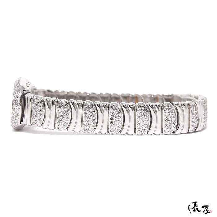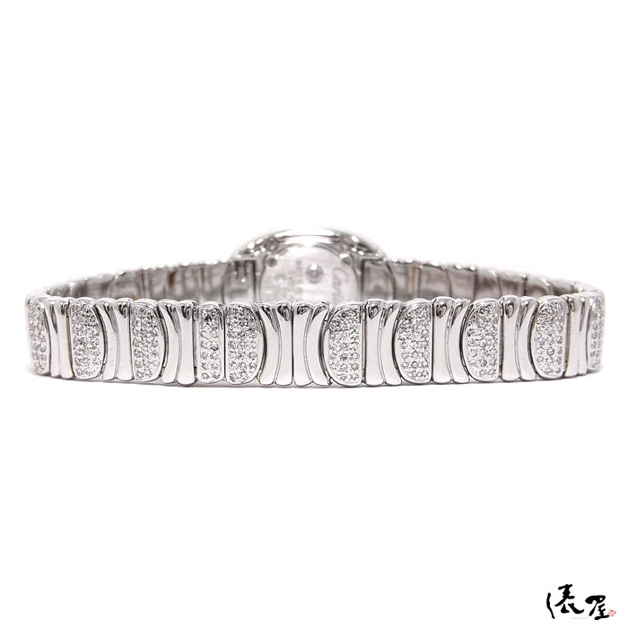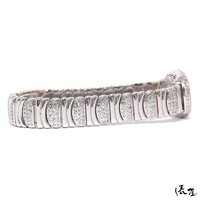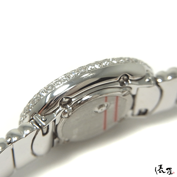 ベゼルとブレスレット全体にダイヤモンドが美しくパヴェセッティングされており、ダイヤモンドが美しく輝いております。 時計というよりも、ジュエリー感覚で着用して頂けます。